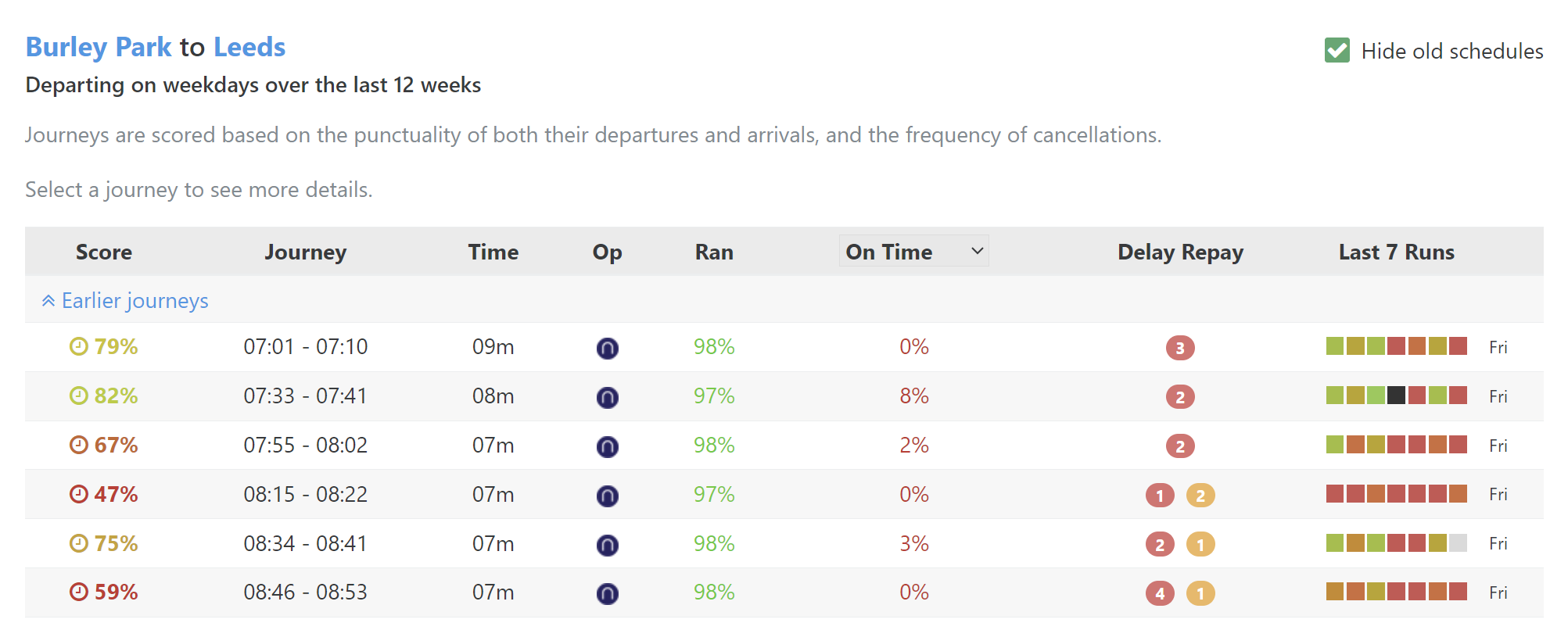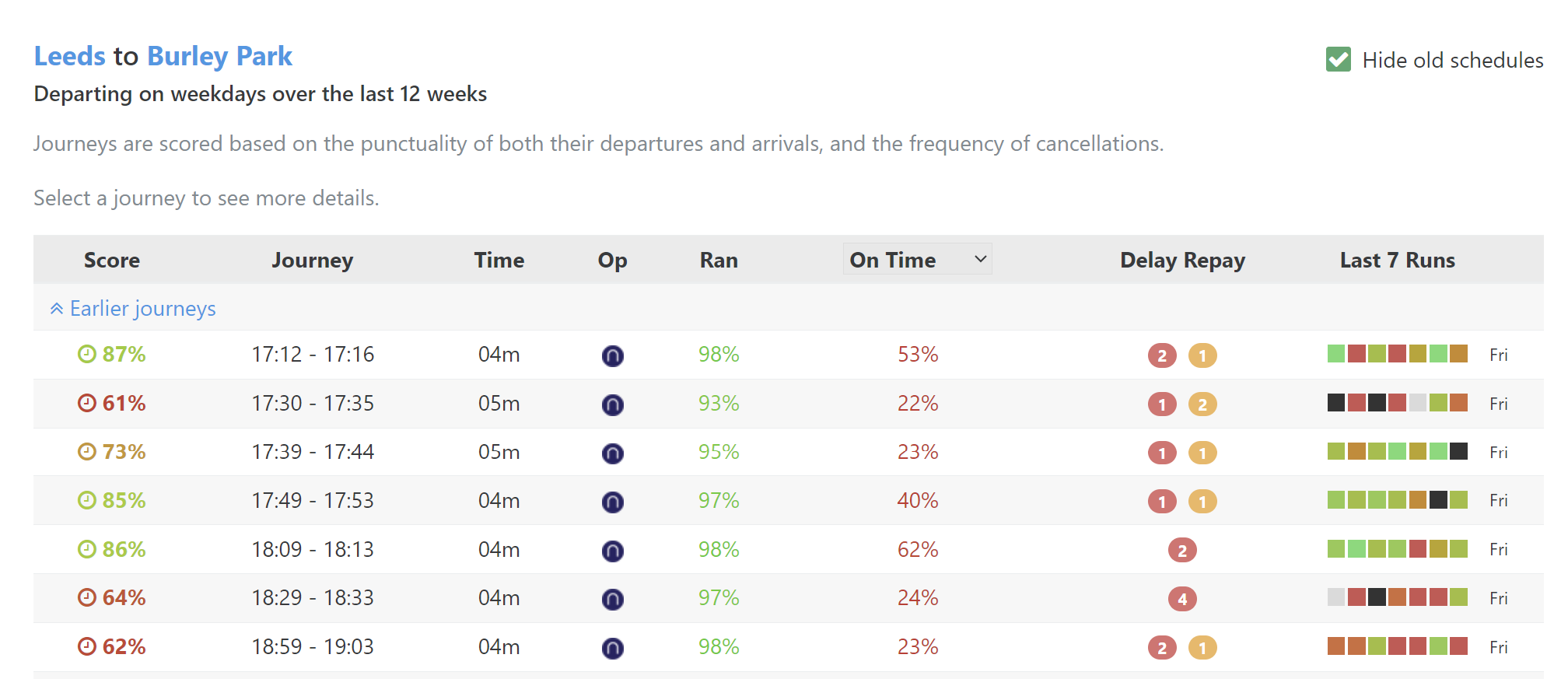 The data says that the reliability of these evening trains is better than in the morning, around a third manage to leave Leeds on time. But for the individual passenger, the reliability is much lower. A train leaving on time that you couldn’t get on doesn’t get you to where you need to be.