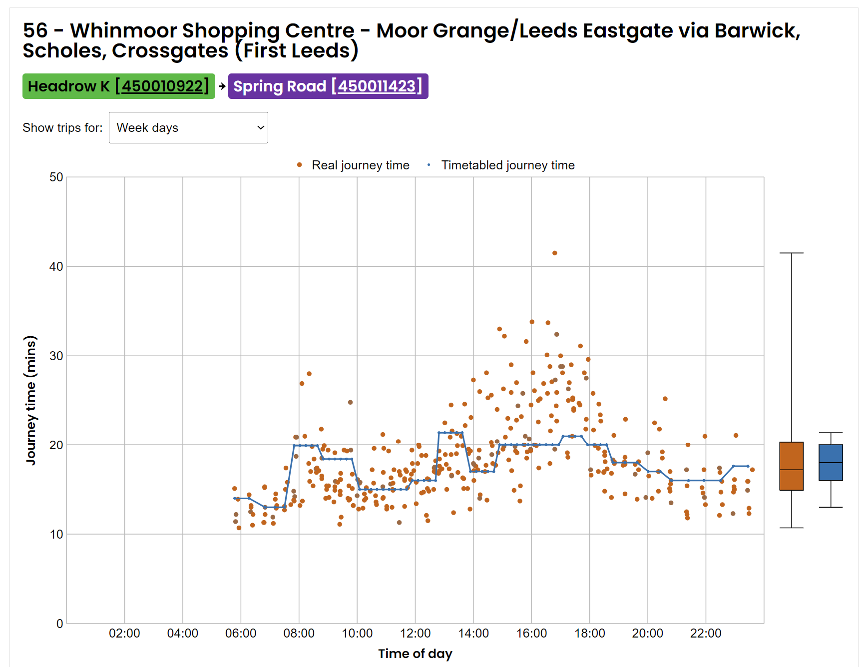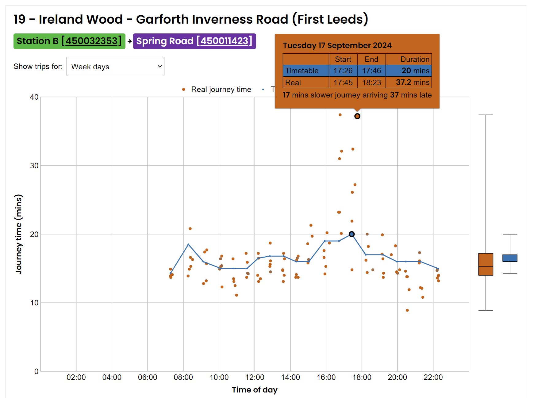 On the way back, things are worse. The same reduced flexibility that leaves trains from Leeds too full to get on does the same to the roads that the bus runs along. About half of the journey that I take on it has a bus lane, but the car traffic is so bad on the rest of the route that this barely matters. At five o’clock in the evening, the hourly bus can arrive between 10 minutes early and 10 minutes late and it typically takes 40 minutes instead of the already padded timetabled time of 20 minutes.
