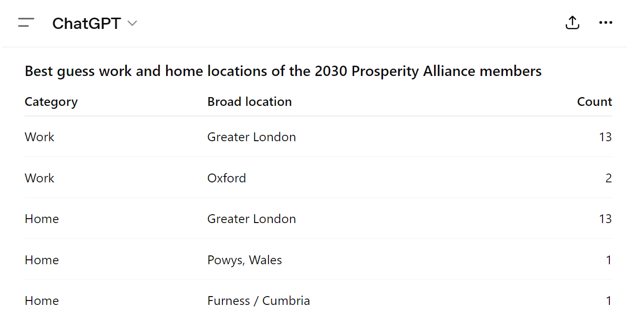 British in quotes, because, as so often, and unless both me and three AI assistants are missing something big, 2030 Prosperity Alliance is almost completely a South East English affair. Some contributors working as far North as Oxford make up the numbers and a few may maintain homes in rural Wales, Scotland, and Cumbria after careers in London, often in between votes at the House of Lords. It is hard to be completely sure where people live and work, but the pattern is overwhelming, even within that uncertainty.