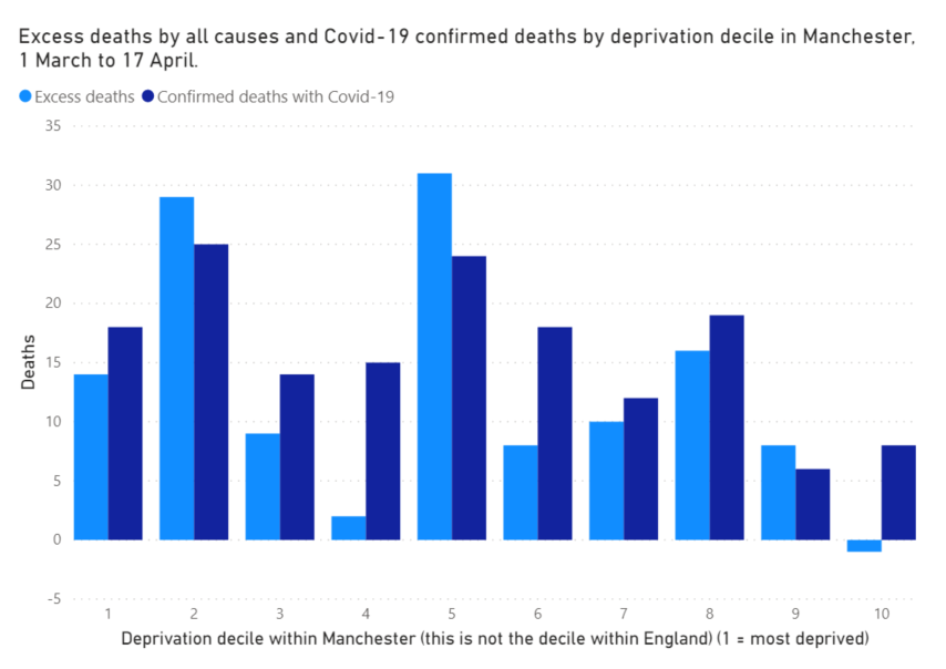 Within statistical significance, within Manchester, all deciles of deprivation have suffered a similar number of deaths from Covid-19, both by the excess death measure and by testing.