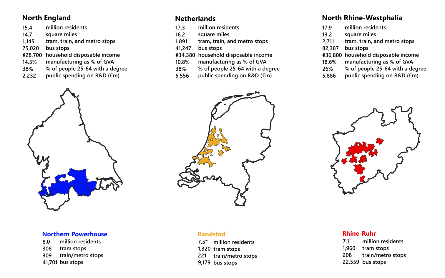 What the North is missing is the transport infrastructure in its urban core to operate as an agglomeration. North England would need three times as many tram stops to rival the Netherlands by that measure, and six times as many to rival the Rhine-Ruhr agglomeration.